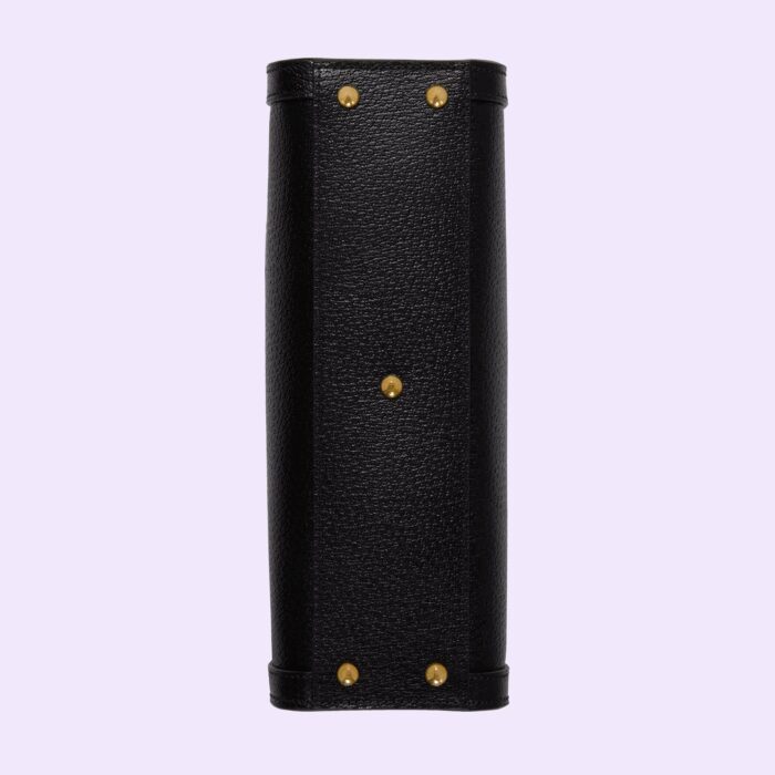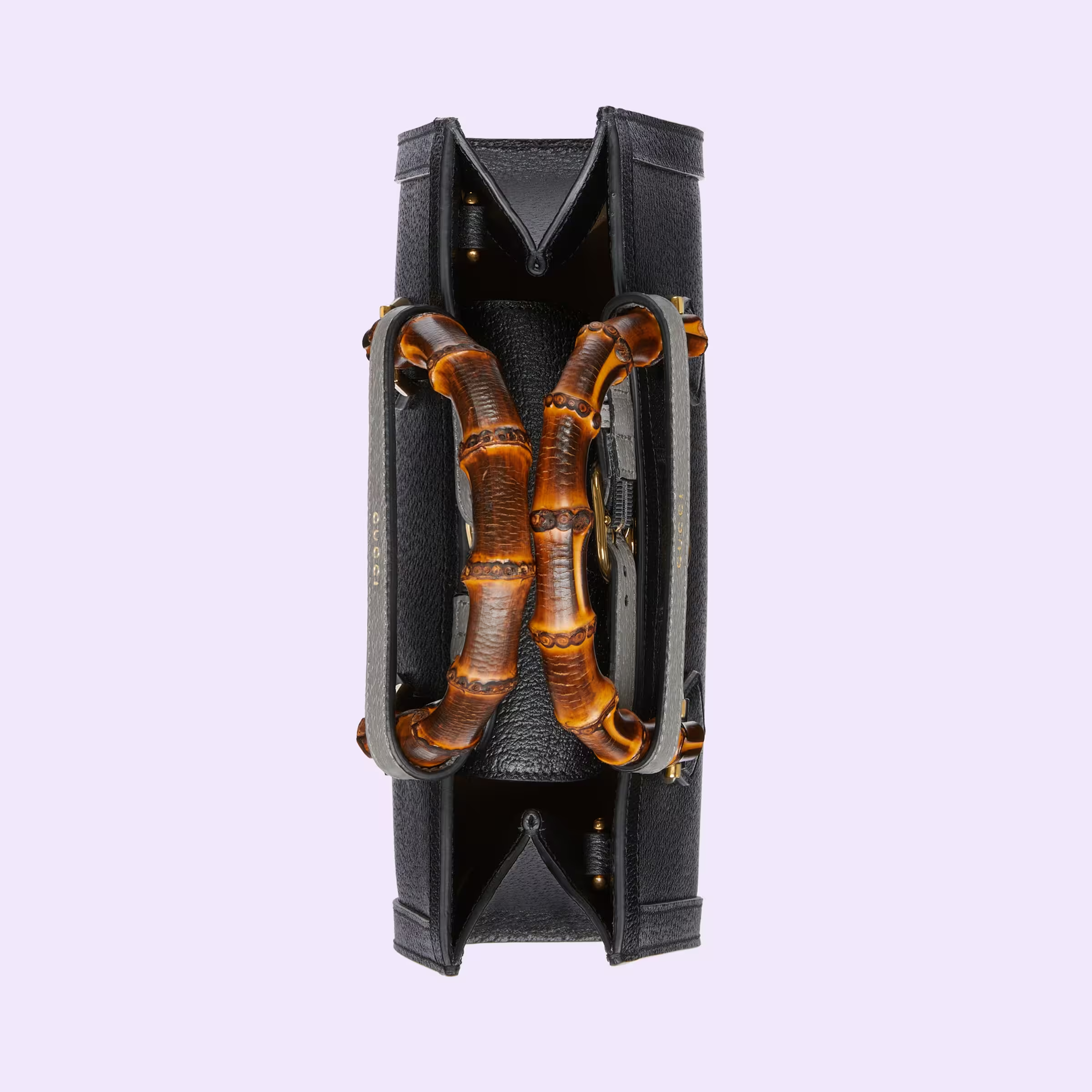 A new shape for Cruise 2023 Gucci Cosmogonie, the Gucci Diana continues to combine recognizable elements of the House with the bamboo handles and Double G hardware. Crafted from black leather, the accessory is further accentuated by two decorative leather belts, a playful reference to the bands used to keep handles in shape.