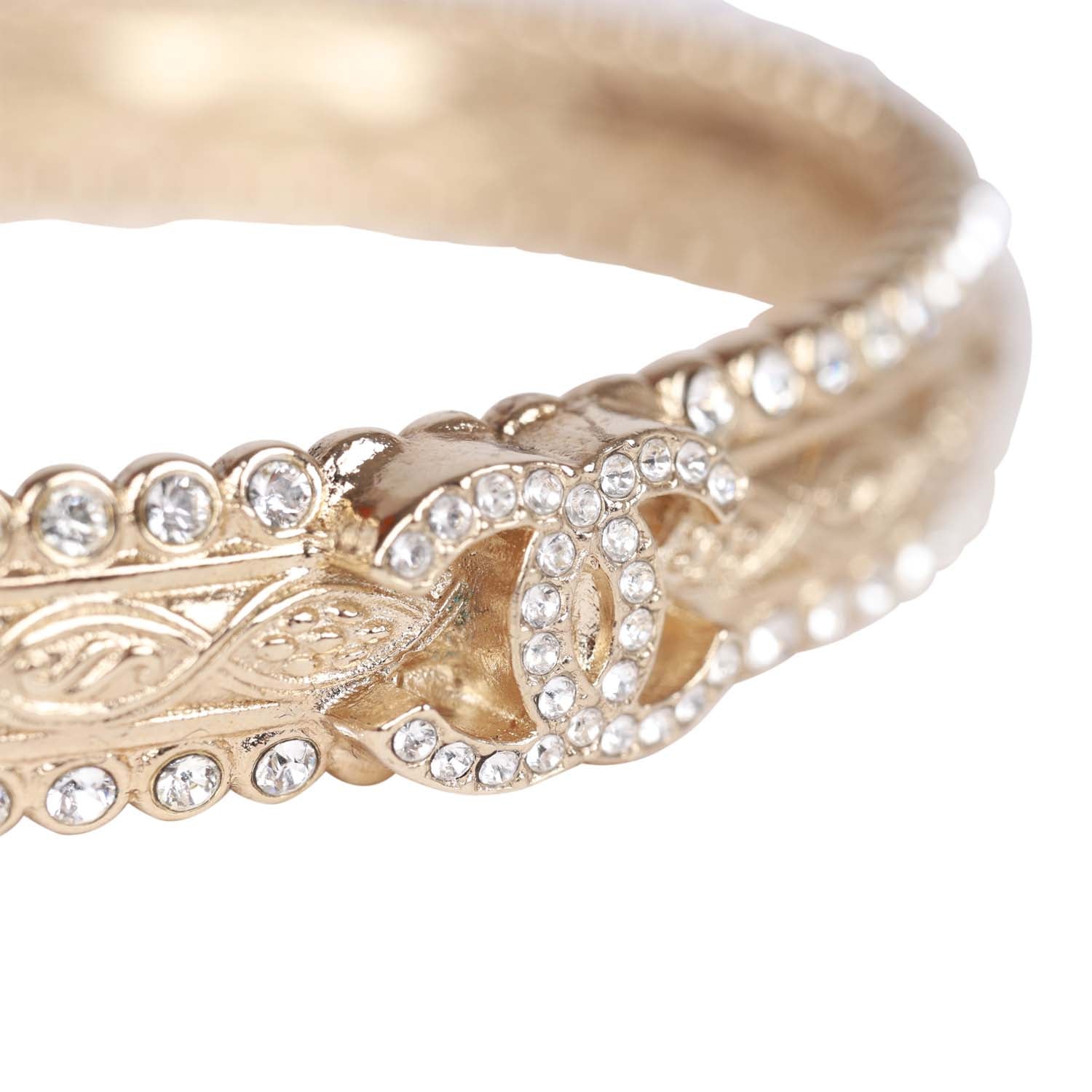 This cuff bracelet is in?gold tone metal with a clear crystal CC logo.