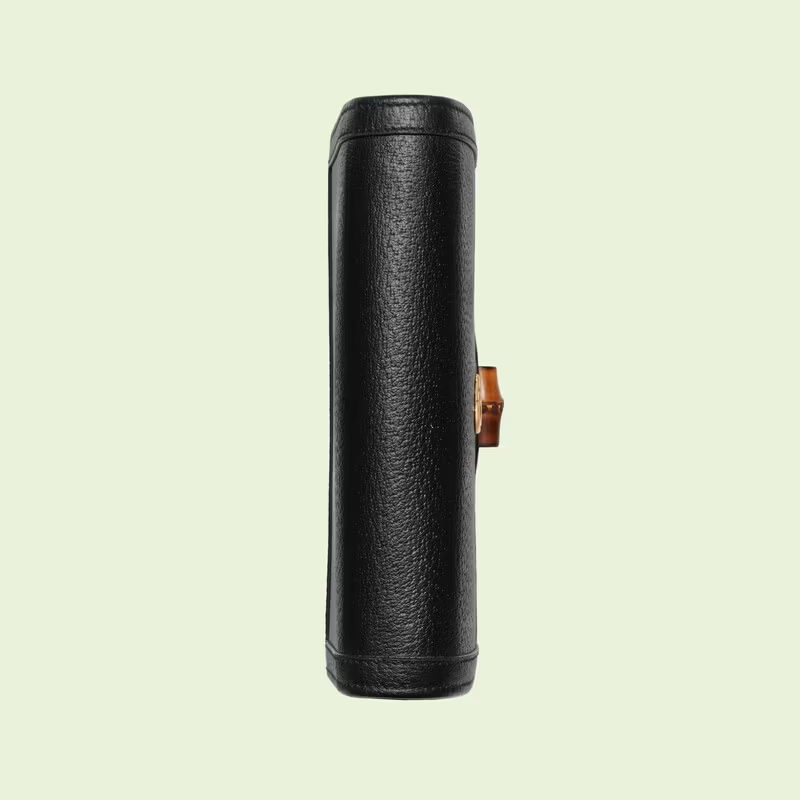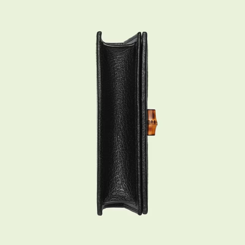 This Diana mini bag is presented in black leather. With a slim silhouette, the style reinvents the handbag’s bamboo handles as a subtle detail at the front.