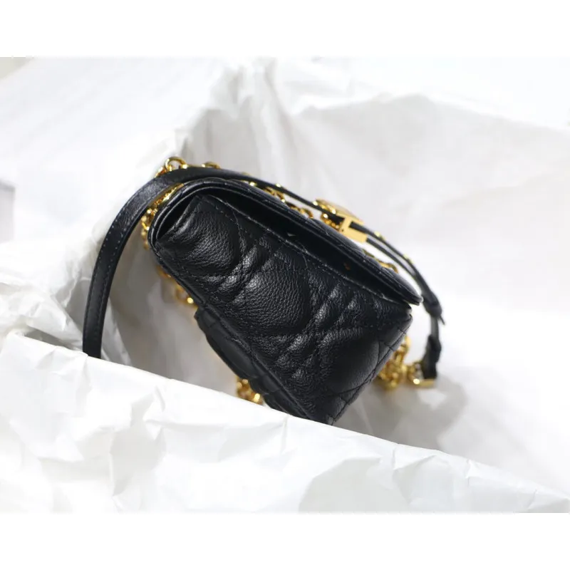 Crafted in black calfskin, the Dior Caro bag showcases the iconic Cannage stitching that instantly catches the eye. Its supple structure features a flap adorned with an antique gold-finish metal twist ‘CD’ clasp, inspired by the seal of a Christian Dior perfume bottle. This intricate detail adds a touch of elegance to the bag.