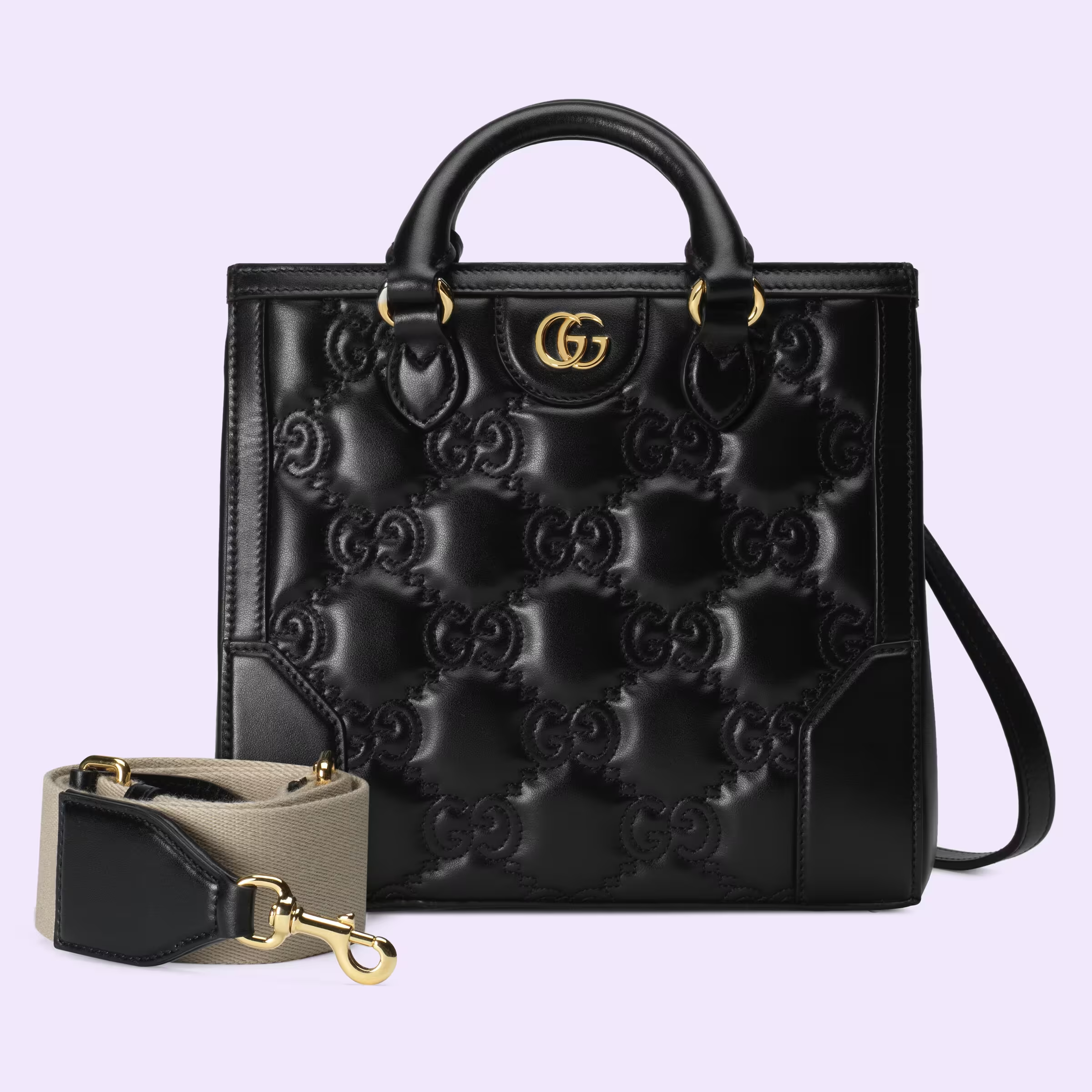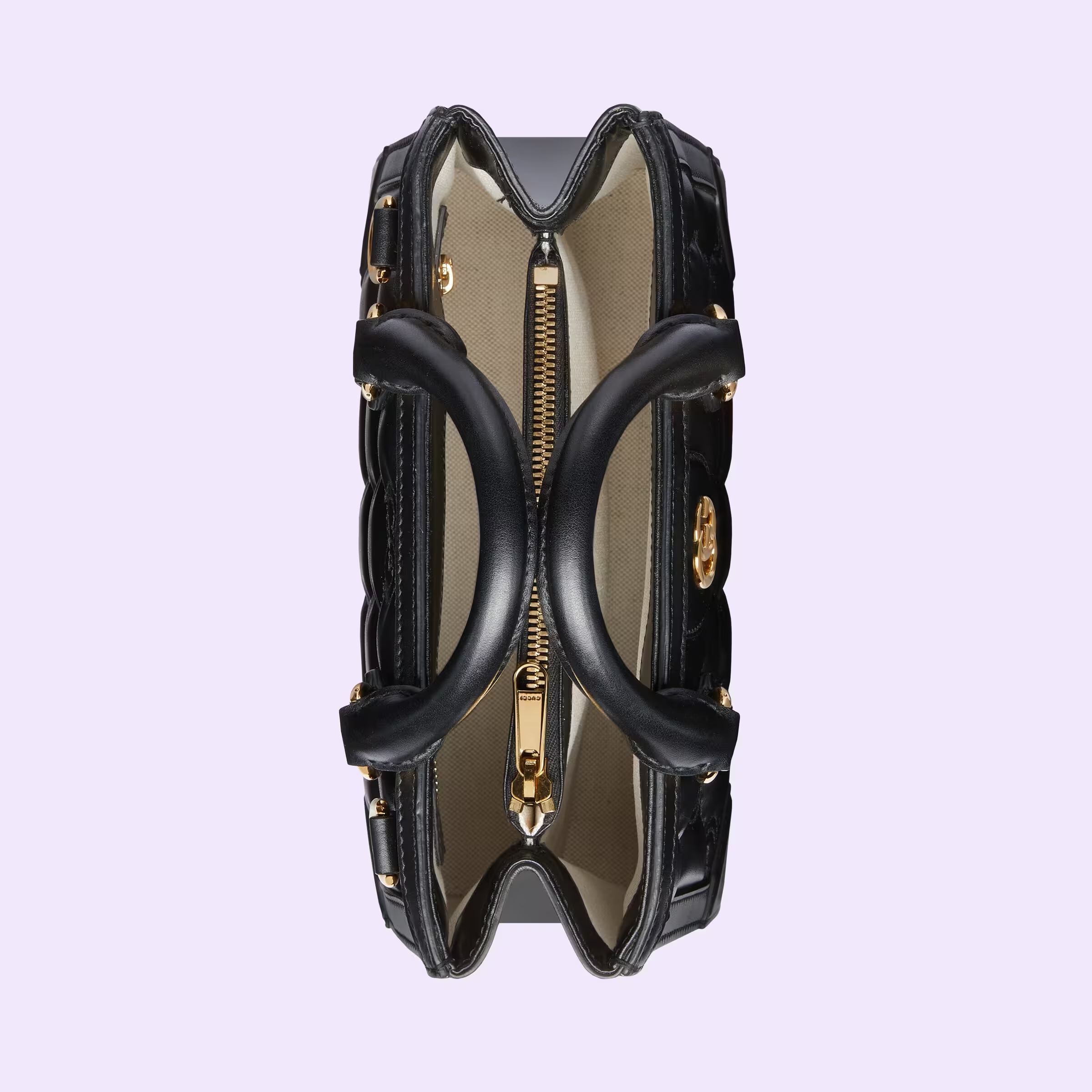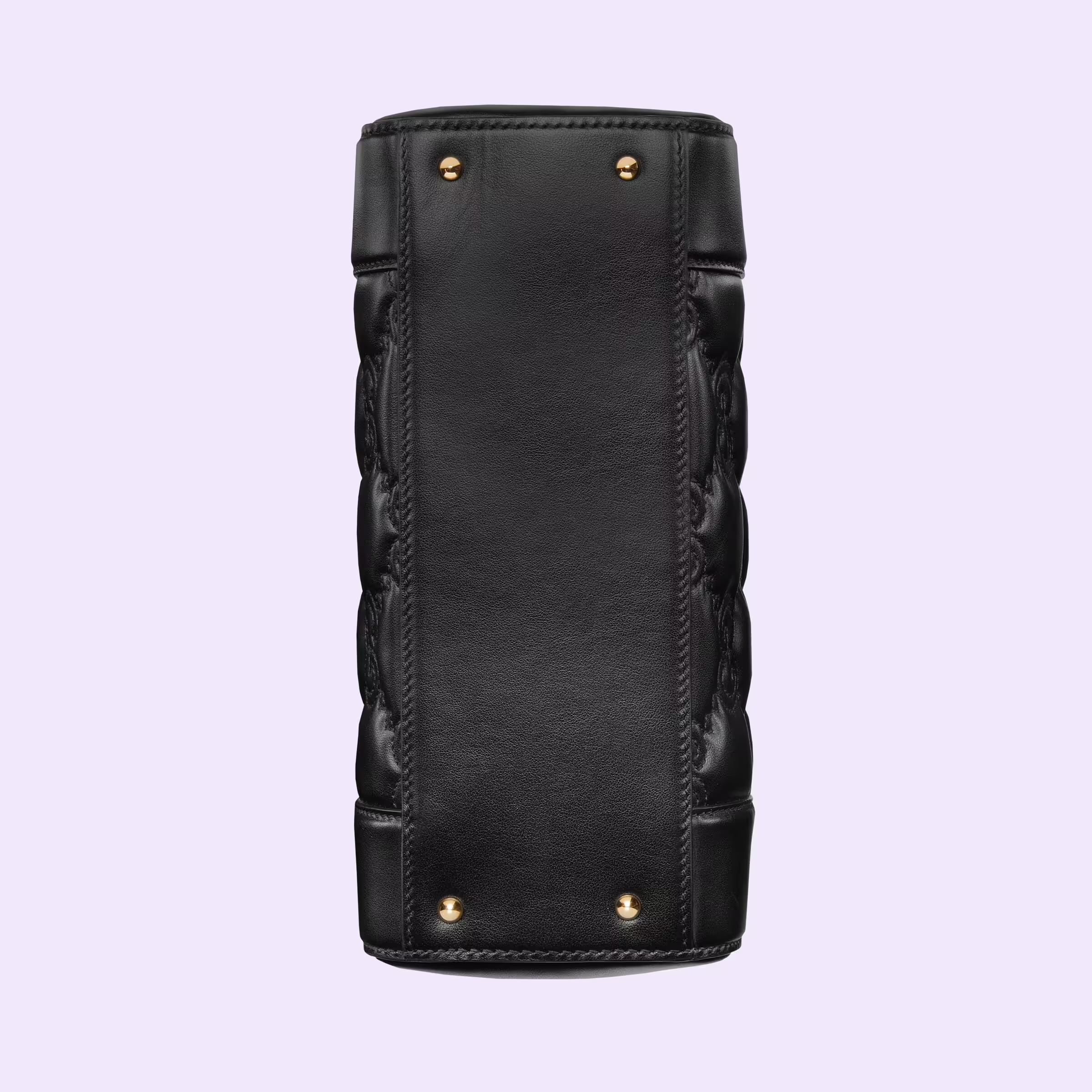Matelassé leather is a signature material of the House, thanks to its super soft finish. The textured GG motif defines a selection of small leather accessories, including this black leather top handle mini bag. The Double G hardware decorates the front, continuing the logo feel of the design.