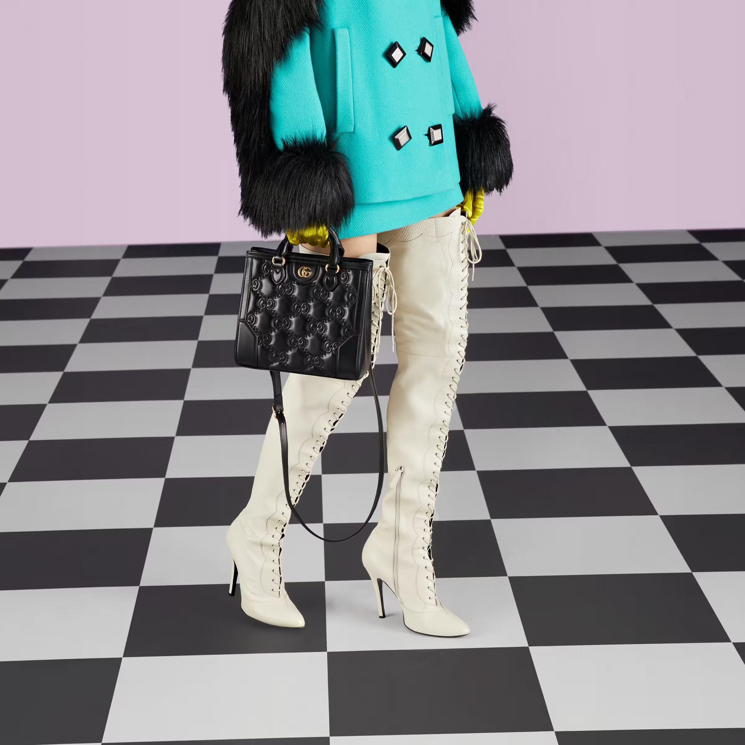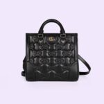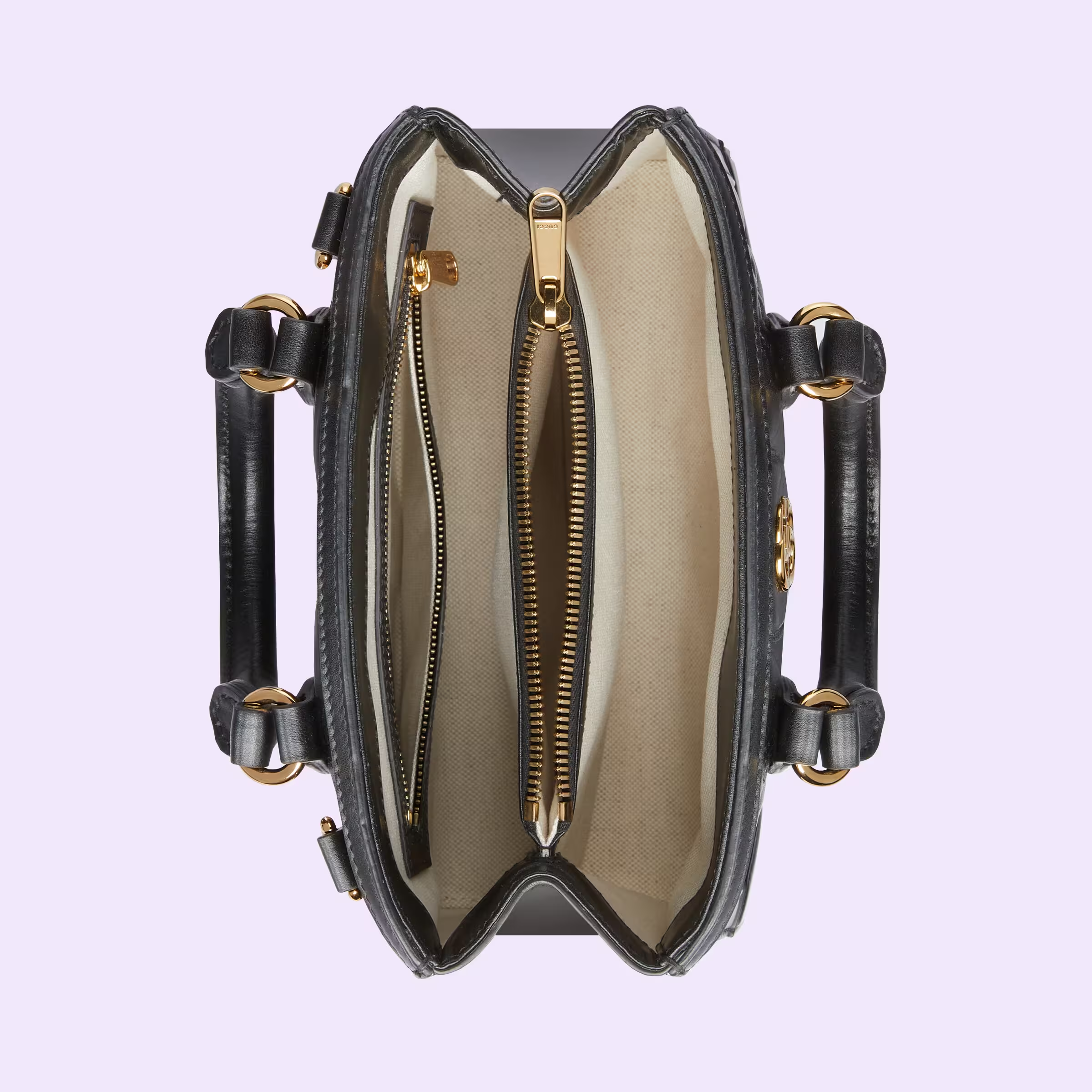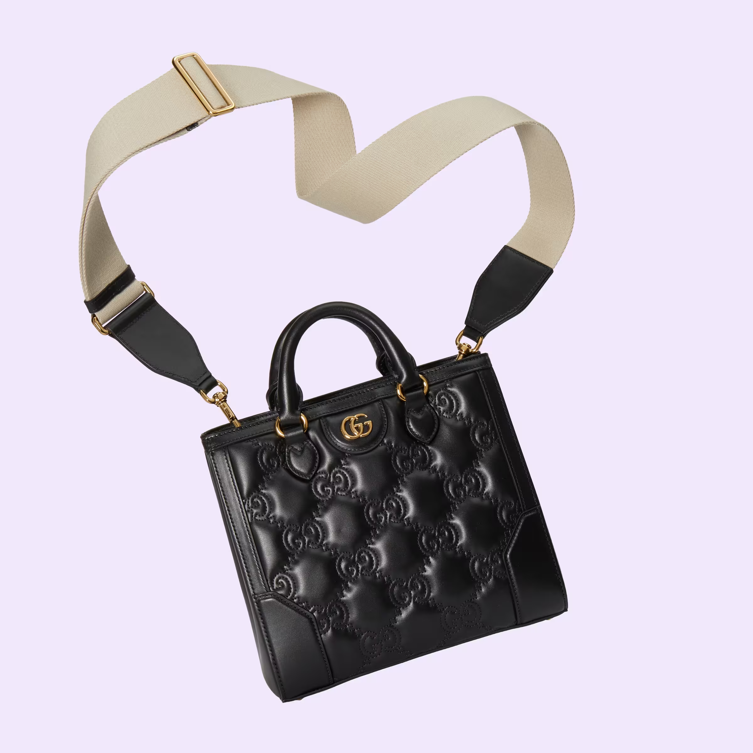 Matelassé leather is a signature material of the House, thanks to its super soft finish. The textured GG motif defines a selection of small leather accessories, including this black leather top handle mini bag. The Double G hardware decorates the front, continuing the logo feel of the design.