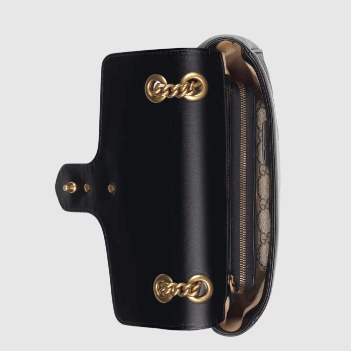 The small GG Marmont camera bag has a softly structured shape and a flap closure with Double G hardware. The sliding chain strap can be worn multiple ways, changing between a shoulder and a top handle bag. Made in matelassé chevron leather with a heart on the back.