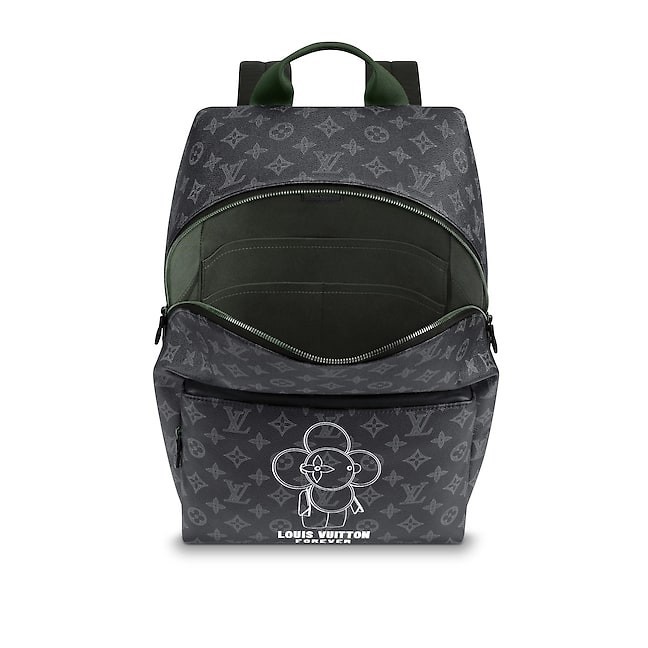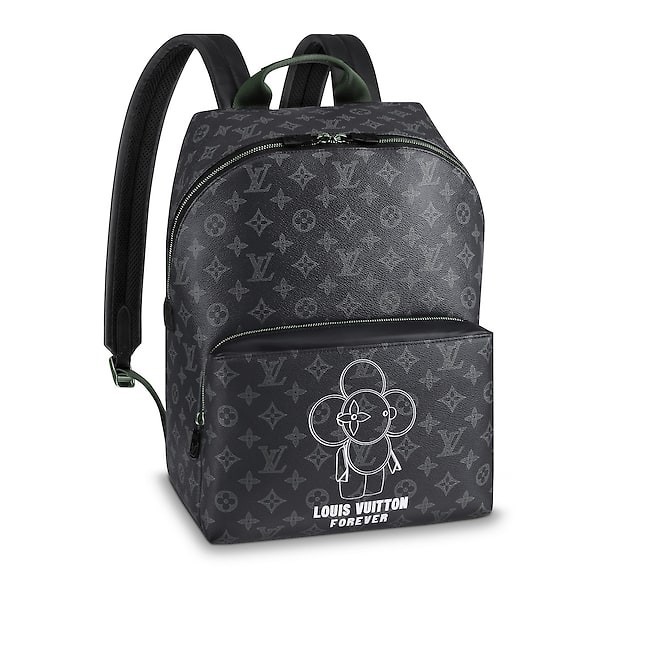 This Apollo backpack is decorated with the Louis Vuitton mascot Vivienne painted by Kim Jones. Made of Monogram Eclipse canvas, embellished with leather and fabric inlays, it is a stylish urban handbag.