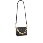 The Coussin BB has the softest cushion-like texture. The Coussin BB is made of puffed lamb leather embossed with a Monogram pattern in a lovely compact size. The chunky gold-colored chain and slender leather strap are both detachable