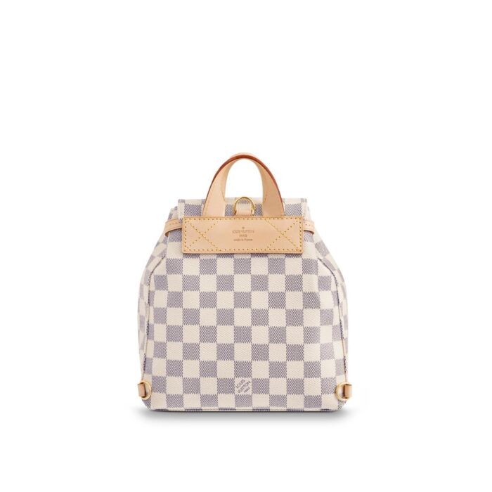 18.5 x 28 x 11.5 cm (Length x heightx width ) •7.3 x 11 x 4.5 inches•Damier Azur coated canvas exterior•Rose Ballerine microfiber lining•Natural cowhide leather trim•Shiny Gold colored metallic pieces•Puffed handle•2 adjustable flat shoulder / cross•body straps•Drawstring top closure secured by a flap and prong buckle closing system with magnet•Exterior zipped pocket•Interior smartphone pocket•Interior D•ring