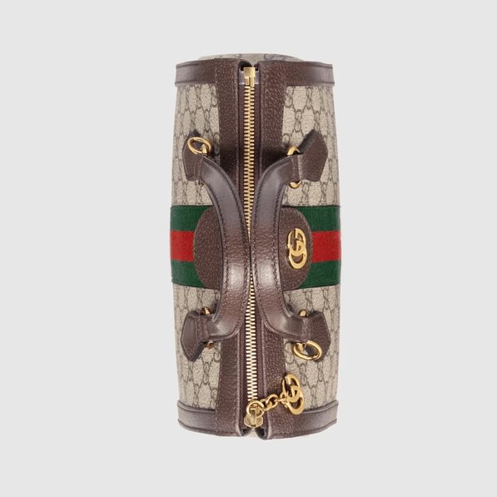 The world of Ophidia evolves with the introduction of a small top handle tote with a detachable shoulder strap. Crafted in GG Supreme canvas with inlaid green and red Web stripe, the accessory is enhanced by a petite play on the Double G, an archival Gucci code from the ’70s that appears atop a leather tab detail and on the zipper pull.