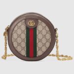 The world of Ophidia evolves with the introduction of a round mini bag with a chain shoulder strap. Crafted in GG Supreme canvas with inlaid green and red Web stripe, the accessory is enhanced by a petite play on the Double G, an archival Gucci code from the ’70s that appears atop a leather tab detail and on the zipper pull.