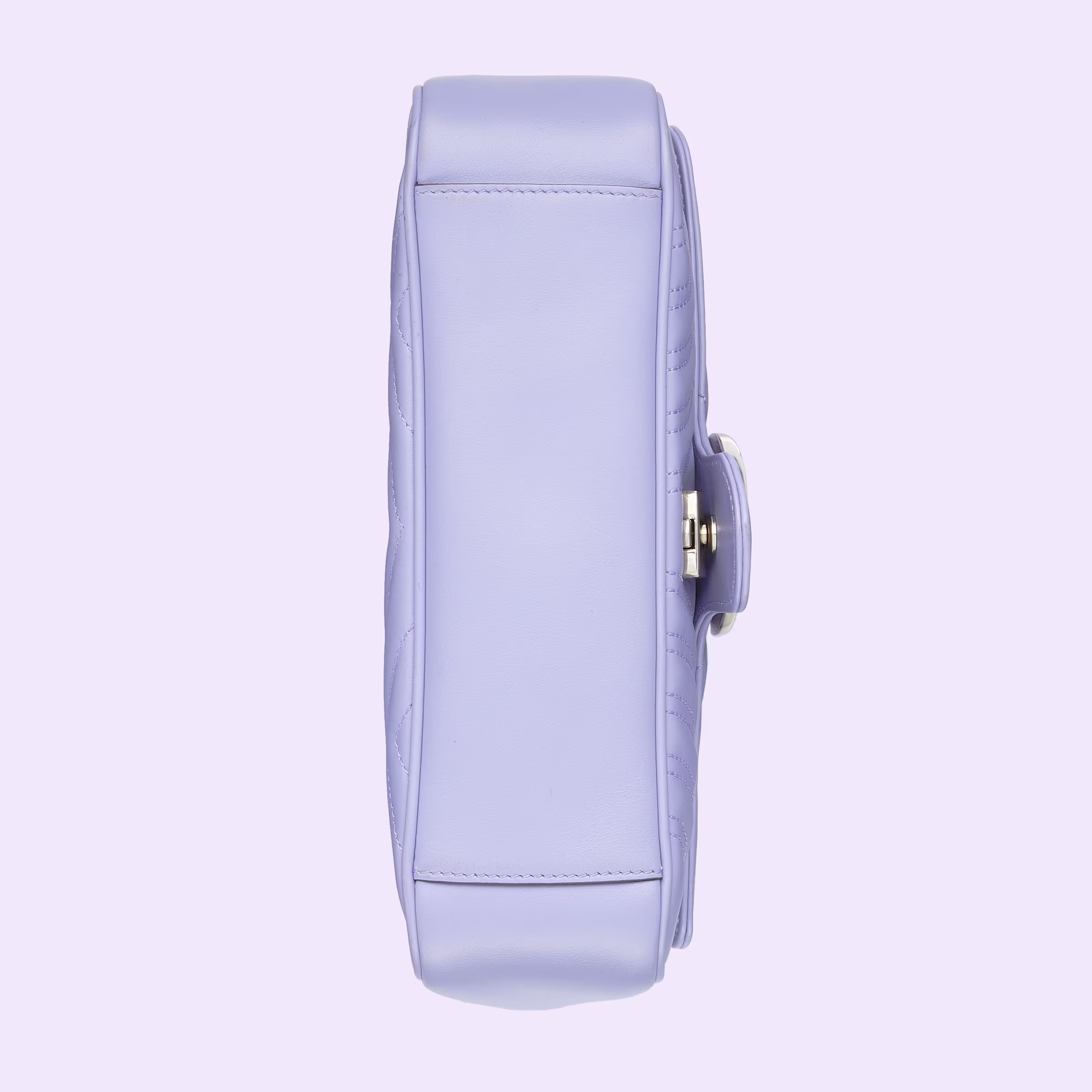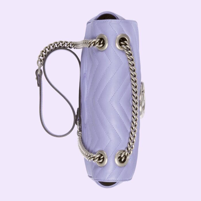 In soft, vibrant hues, pastels continue to be explored throughout the latest collections. Made in matelassé chevron leather with a heart on the back in a light shade of lilac the now recognizable small GG Marmont chain shoulder bag has a softly structured shape and a flap closure with Double G hardware. Designed to be worn multiple ways, the chain strap slides to change between a shoulder and a top handle bag.