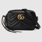 The mini GG Marmont chain shoulder bag has a softly structured shape and a zip top closure with Double G hardware. The chain shoulder strap has a leather shoulder detail. The camera bag is made in matelassé leather with a chevron design and GG on the back.