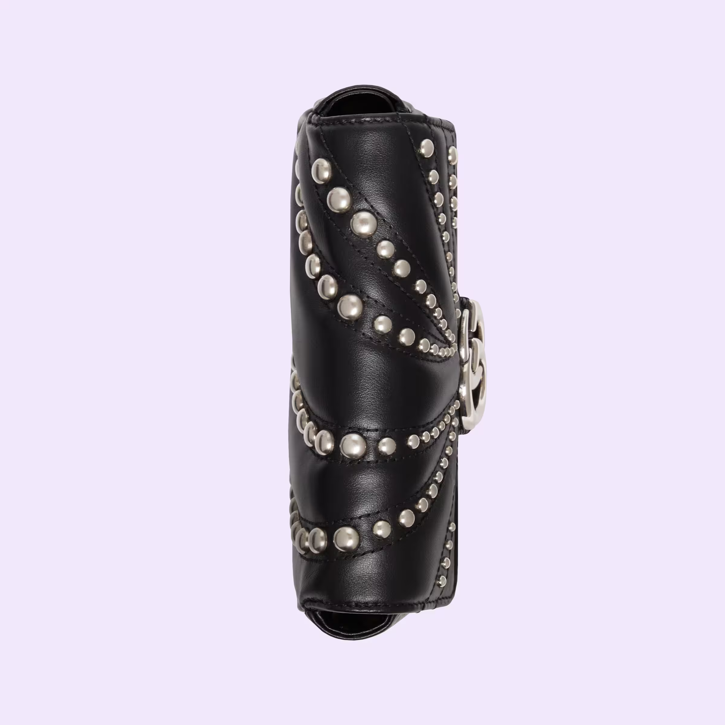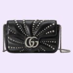 Heritage elements are reimagined with a contemporary twist throughout Cruise 2023 Gucci Cosmogonie. A nod to Gucci’s Founder, the Double G has appeared throughout the House’s collections season after season. Here, this GG Marmont super mini bag is presented in black leather with a spiral stud detail, a nod to the rockstar theme that permeates the collection.